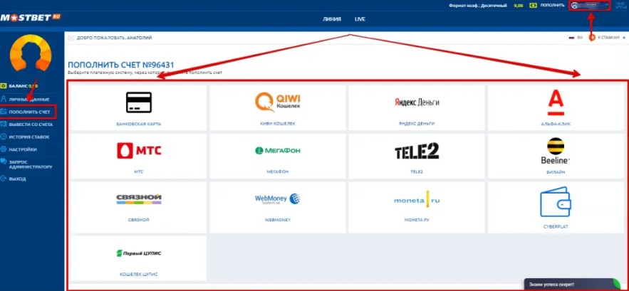 Зарегистрированным пользователям откроются все пункты меню личного кабинета Мостбет, а именно: